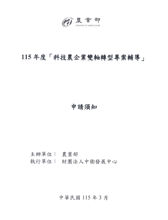 轉知:農業部委託財團法人中衛發展中心執行115年度「科技農企業雙軸轉型專案輔導」,自即日起受理申請
