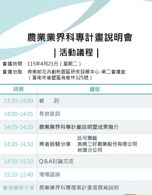 轉知:《115年農業科技產業化資源聯合說明會》報名開跑!
