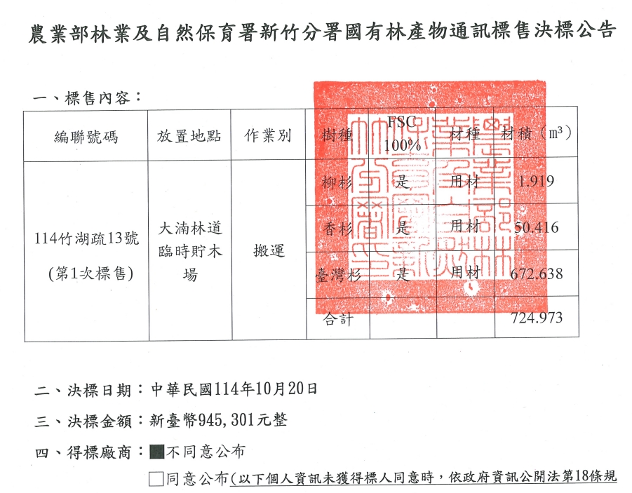 轉知:農業部林業及自然保育署新竹分署114竹湖疏13號(第1次標售)國有林林產物決標公告