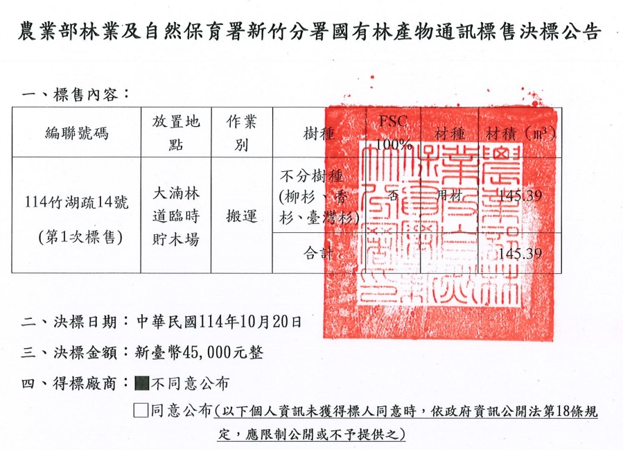 轉知:農業部林業及自然保育署新竹分署114竹湖疏14號(第1次標售)國有林林產物決標公告