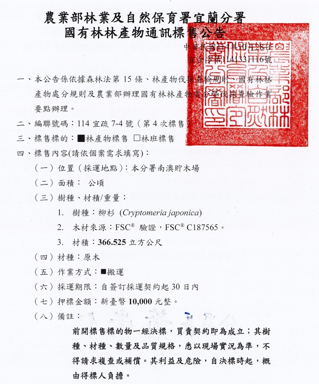 11月7日辦理114宜疏7-4號國有林產物公開標售(第4次公告)