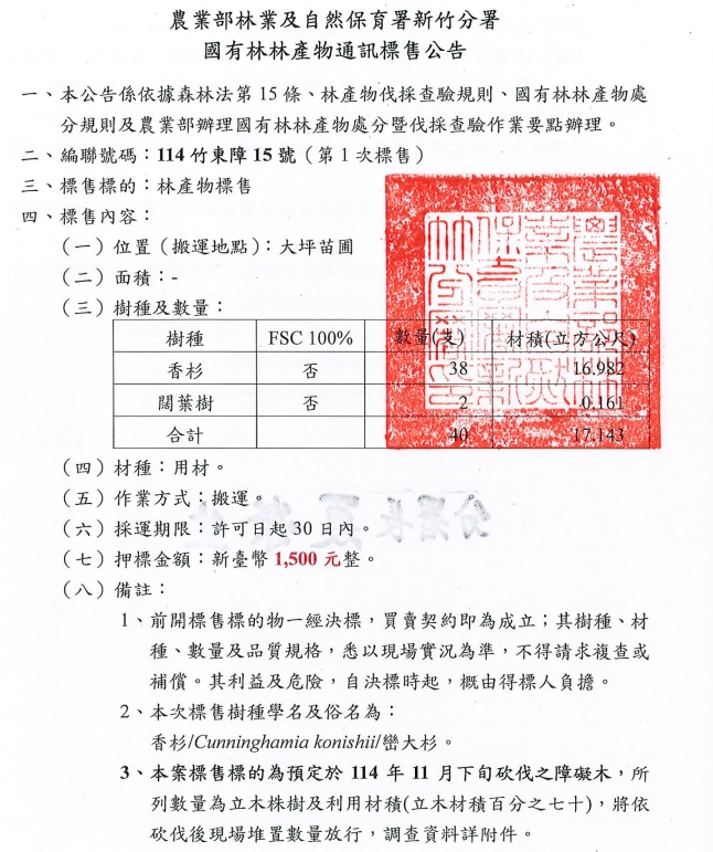 轉知:農業部林業及自然保育署新竹分署訂於114年11月10日辦理「114竹東障15號」第1次國有林林產物公開標售作業