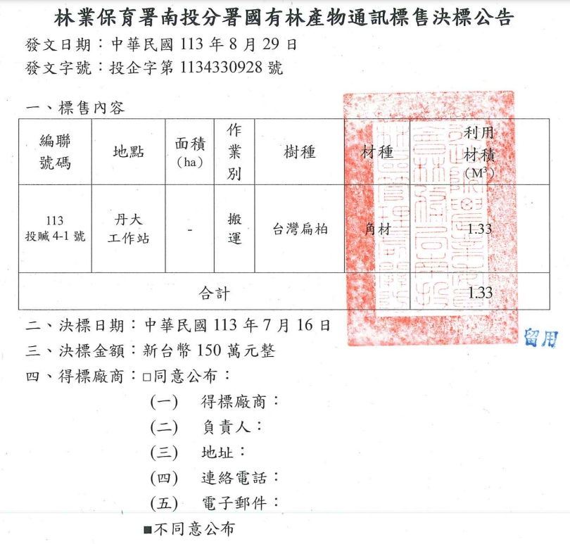 轉知:南投分署訂於114年4月29日下午14時辦理114投漂1-1號國有林林產物處分公開標售作業(第1次標售)
