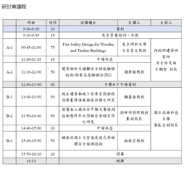 共同主辦:財團法人台灣建築中心、財團法人消防安全中心基金會、社團法人台灣防火材料協會、社團法人美國消防工程師學會台灣分會、中華木質構造建築協會