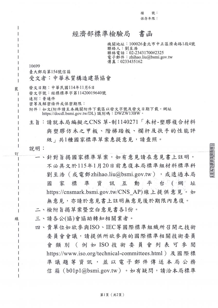 轉知:經濟部標檢局編擬之CNS草-制1140271 木材-塑複合材料與塑膠仿木之甲板、階梯踏板、欄杆及扶手的性能評級」共1種國家標準草案惠提意見2025 - 11 - 06
