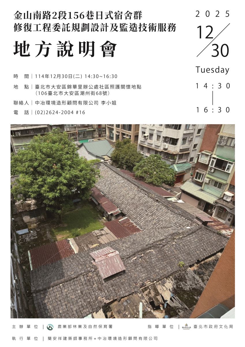 農業部林業及自然保育署於本(114)年12月30日(星期二)下午2:30到4:30辦理金山南路2段156巷日式宿舍群修復工程委託規劃設計及監造技術服務地方說明會,歡迎踴躍參加。