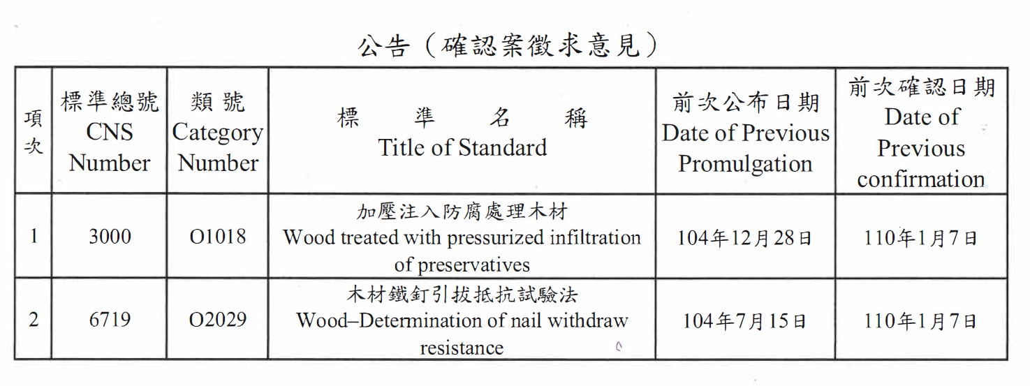 轉知:經濟部標準檢驗局辦理,木業類 CNS 3000「加壓注入防腐處理木材」及CNS 6719「 木材鐵釘引拔抵抗試驗法」公告徵求修訂或廢止意見2026 - 03 - 25