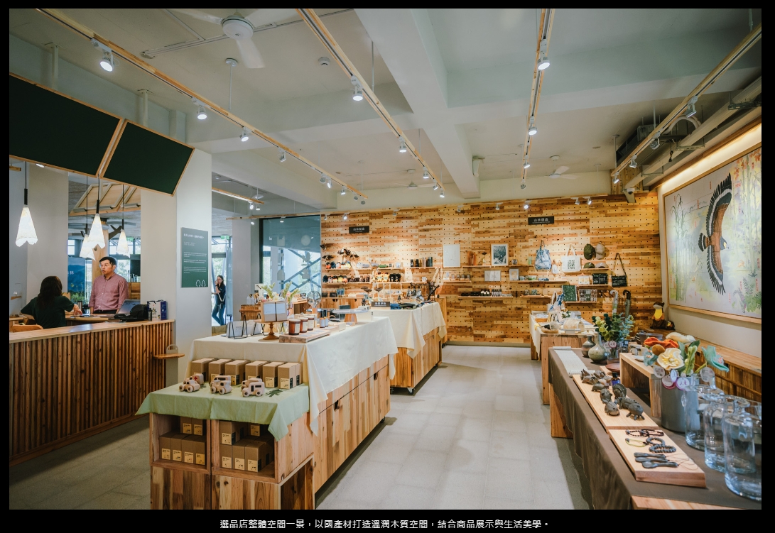 在空間設計上,選品店以「五感體驗」為核心,運用木質建材、自然光影與通風設計,營造溫潤舒適的森林氛圍。牆面藝術由藝術家劉曉蕙創作,以蔗渣手工紙描繪平地森林從開墾到復育的變遷,成為空間中的敘事亮點。