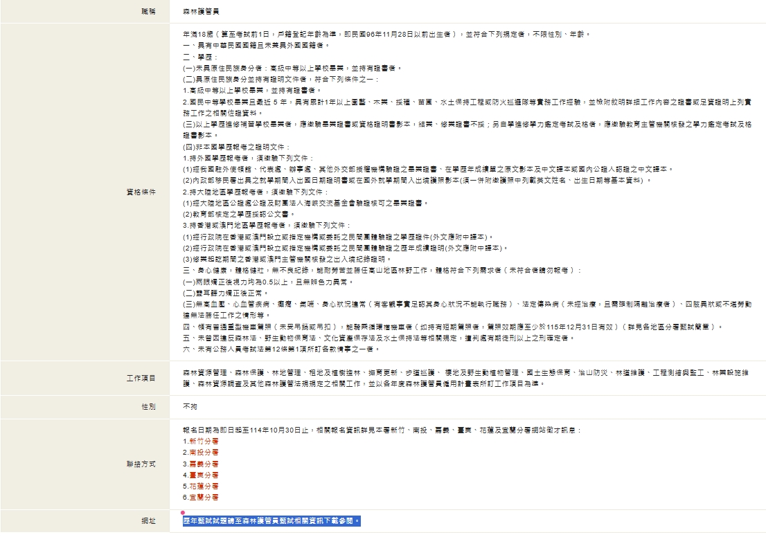 轉知:農業部林業及自然保育署各地區分署115年森林護管員甄試