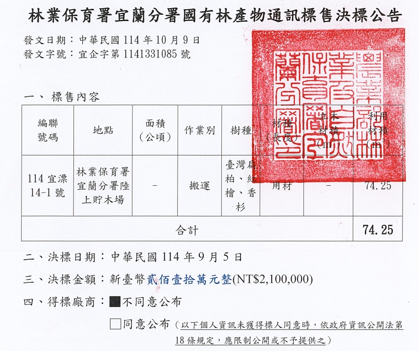 轉知:林業保育署宜蘭分署114宜漂14-1號國有林產物標售決標公告