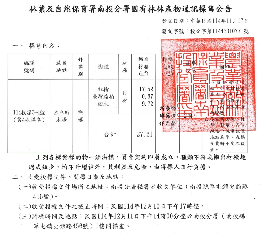 12月11日辦理114投漂3-4號國有林產物公開標售作業(第4次標售)