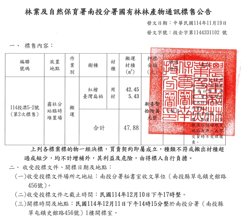 12月11日辦理114投漂5-2號國有林產物公開標售作業(第2次標售)