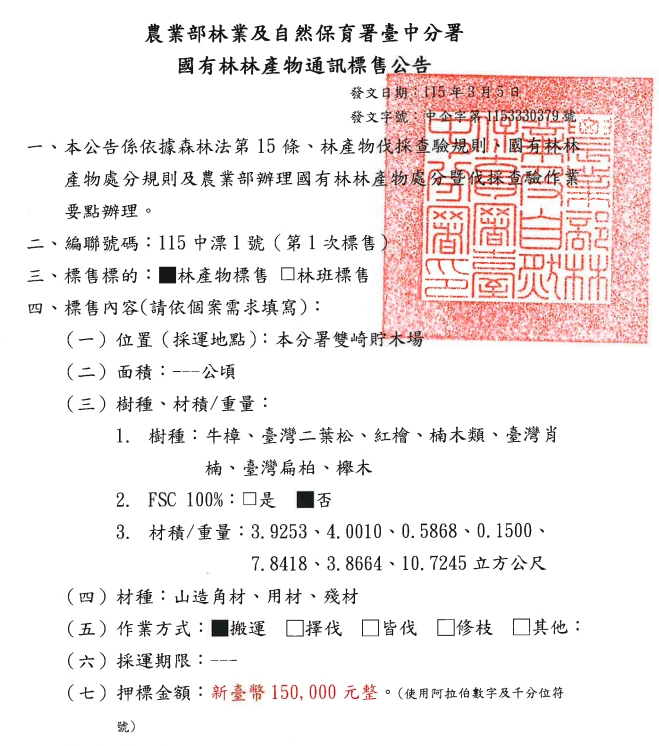 3月27日辦理115中漂1號國有林產物公開標售(第1次公告)