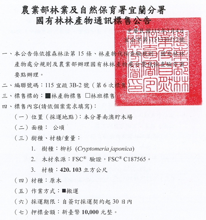 3月23日辦理115宜疏3B-3號國有林產物公開標售(第7次公告)