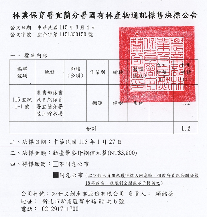 轉知:農業部林業及自然保育署宜蘭分署115宜疏1-1號標售決標公告