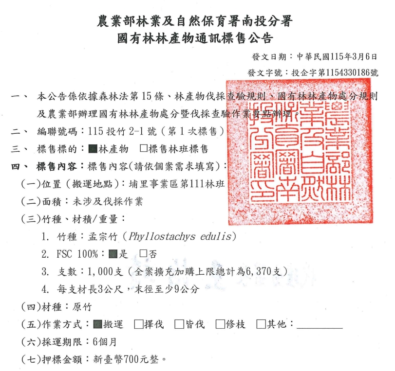轉知:南投分署訂於115年3月26日辦理115投竹2-1號國有林產物標售作業(第1次)