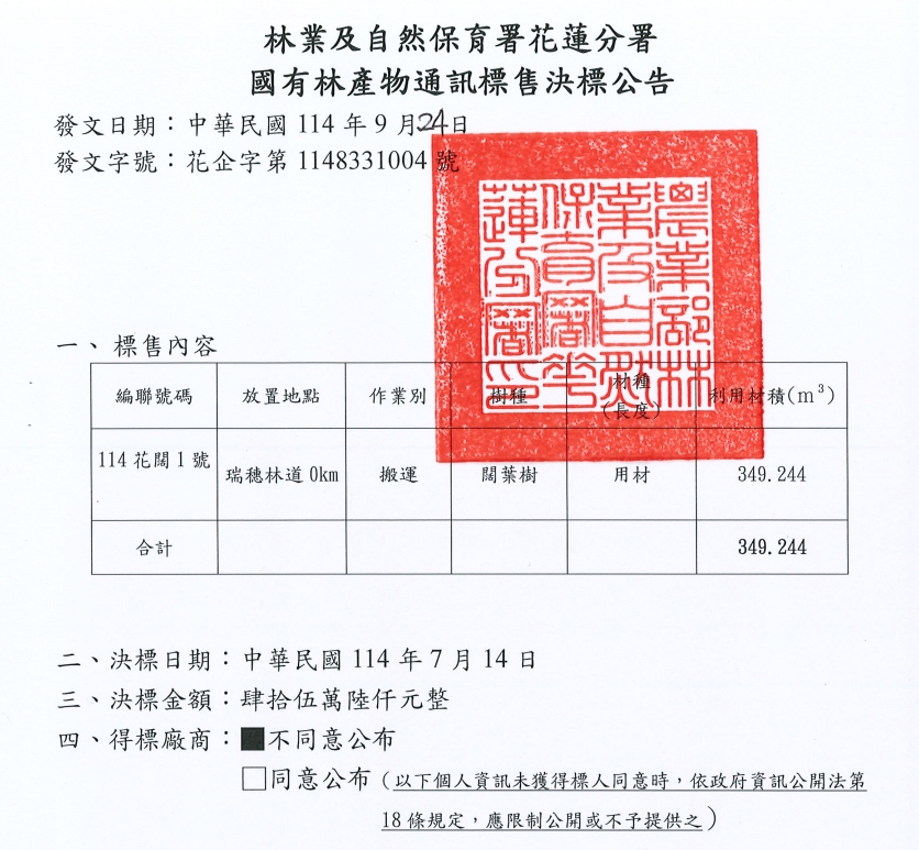 轉知:農業部林業及自然保育署花蓮分署114花闊1號決標公告