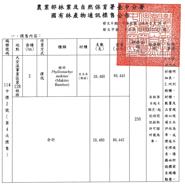 9月30日辦理114投標1-1號國有林產物公開標售作業(第1次標售)